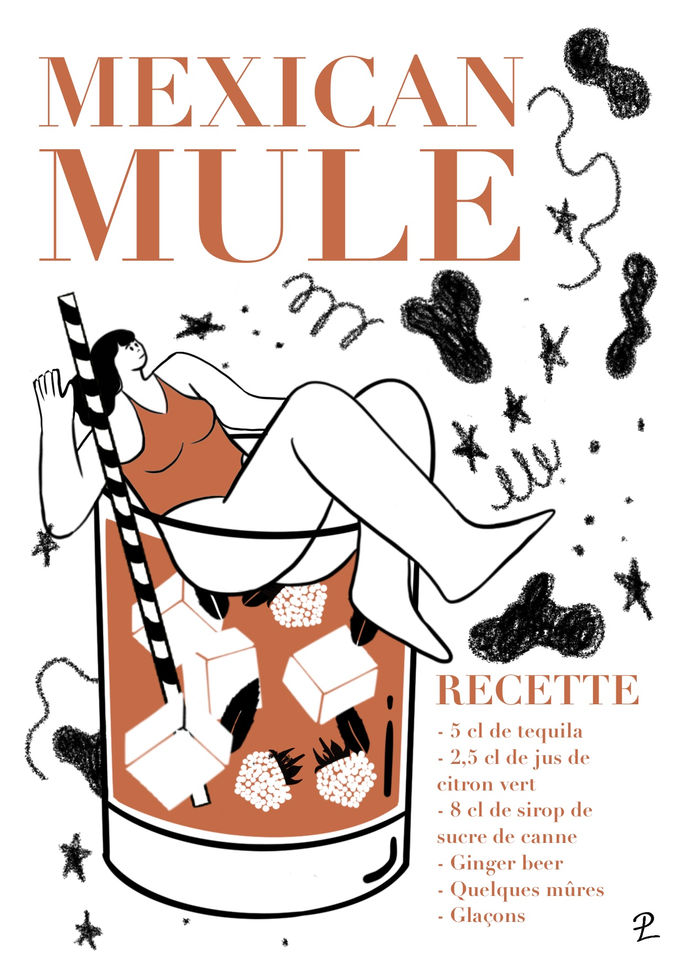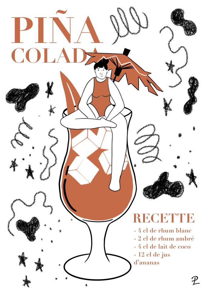 Création d’illustrations pour des recettes de cocktails. Recherches pour les corps et positions, et recherches de motifs avec tests de textures.